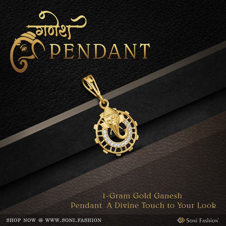 This 1 gram gold plated Om pendant for men features a shining, round design with a religious and stylish touch. Crafted with miligram gold and adorned with a Ganpati/Ganesha motif, this pendant is also accented with a sparkling diamond and made of quality brass. Elevate your style with this fabulous pendant.