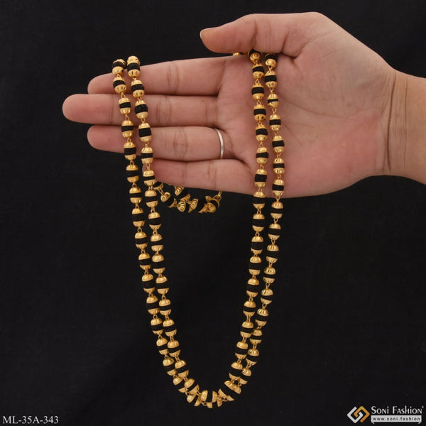 This 1 gram gold plated Rudraksha mala features a unique 2 line glittering design. Handmade with brass and black mala, it adds a religious and royal touch to any outfit....