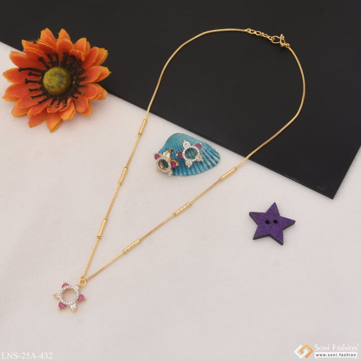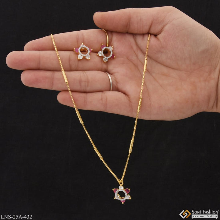 This charming necklace set is perfect for adding a touch of royalty to any outfit. The textured design, combined with shining brass and 1 gram of gold plating, creates a beautiful and trendy piece. The stunning pink accents and sparkling diamond add a touch of elegance to this must-have accessory.