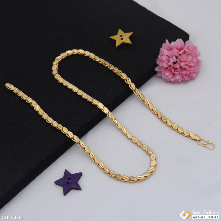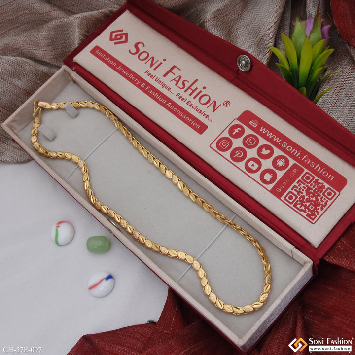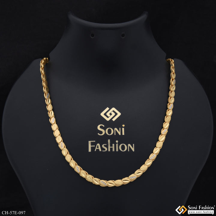 This 1 Gram Gold Plated Prominent Design Chain for Men blends style and durability with a 20-inch length crafted from brass and miligram gold plating. Featuring a matt finish and rhodium shine, it offers a refined golden look that complements any outfit while ensuring long-lasting wear. Perfect for everyday use or special occasions, this chain combines classic appeal with modern design.