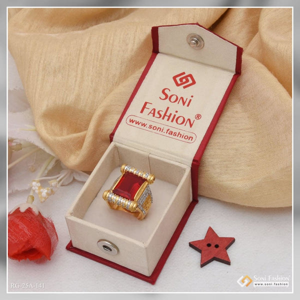 1 Gram Gold Plated Red Stone With Diamond Gold Plated Ring For Men - Style A141