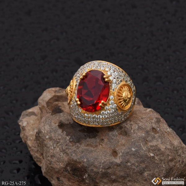 1 Gram Gold Plated Red Stone With Diamond Gorgeous Design Ring For Men - Style A867
