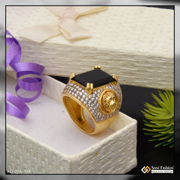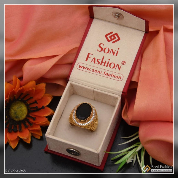1 Gram Gold Plated Black Stone With Diamond Best Quality Ring - Style A968