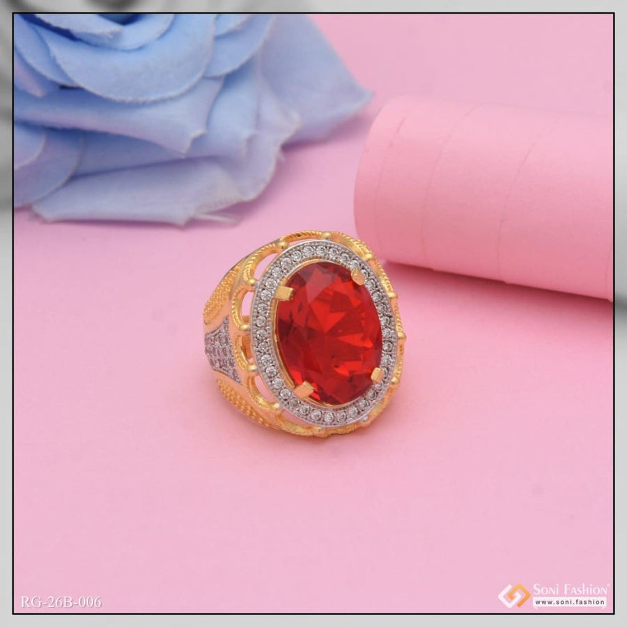 1 Gram Gold Plated Red Stone with Diamond Amazing Design Ring for Men - Style B475