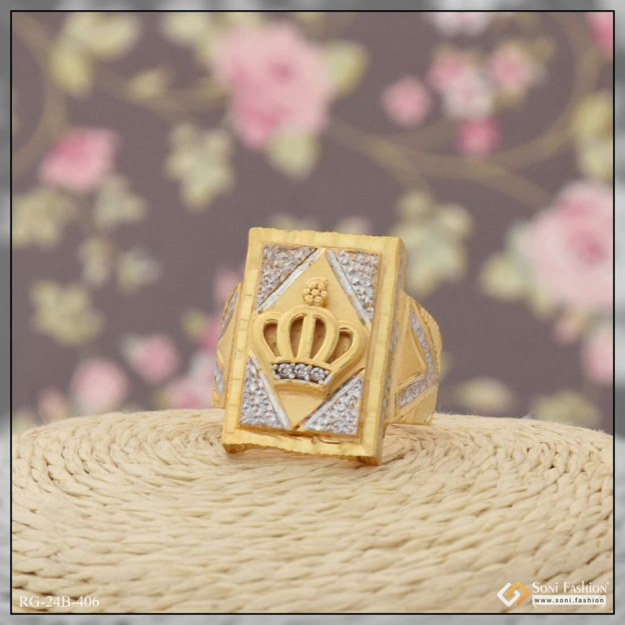 This 1 gram gold-plated men's ring features a stunning filigree design crafted from durable brass. Accented with sparkling diamonds, it offers a royal and shining look that complements any style....