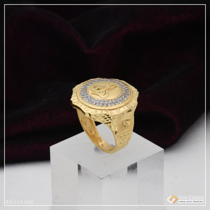 This stunning 1 Gram Gold Forming Goga with Diamond Fashionable Design Gold Plated Ring has vintage, textured, shining, round, rhodium, religious, Rajwadi, and miligram gold features. Its brass construction is beautifully adorned with a diamond for a luxe look. Perfect for a groom who appreciates timeless style.