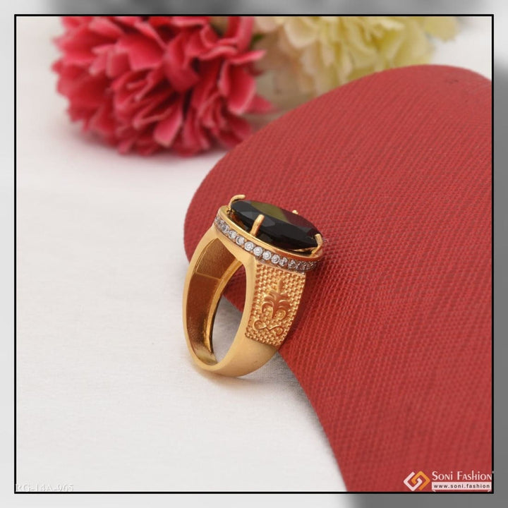 This fashionable design ring is crafted with precision. Featuring a textured stone with shining rhodium, 1 gram of gold, and a matt finish, it is perfect for a groom to wear on his special day. The golden ring is also set with a diamond and brass, creating an elegant black ring that's sure to be noticed.