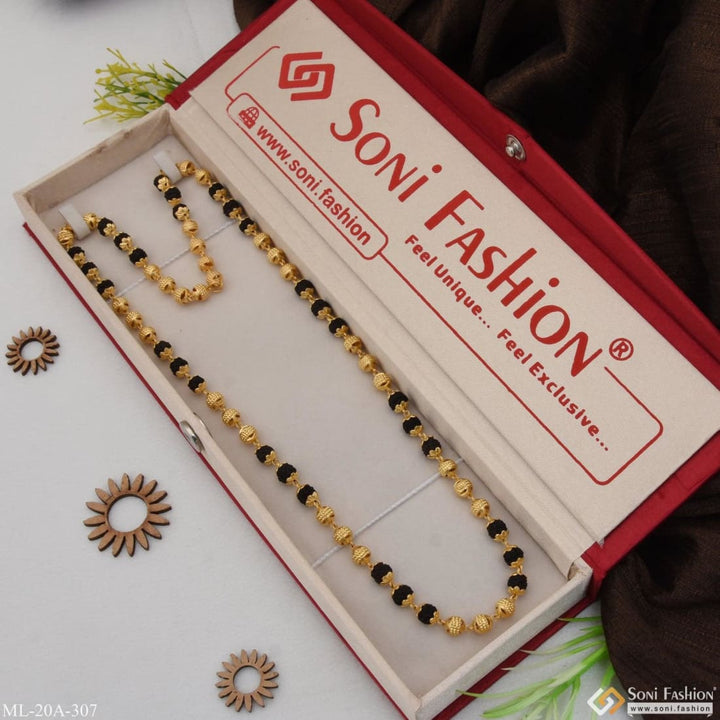 A sophisticated and spiritual accessory, by Rudraksha, is a 1 Gram Gold Plated Etched Design High-Quality Mala designed for men. It is handcrafted with hand milligram Gold, brass, religious Rudraksha beads and a textured, shining black mala. This timeless piece of art adds an antique, stylish look to any groom.
