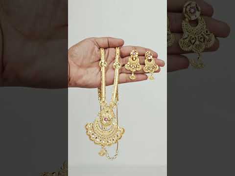 This 1 gram gold plated necklace set is a shining, royal, and eye-catching addition to any woman's jewelry collection. The finely detailed filigree design, crafted in brass, exudes luxury and sophistication....