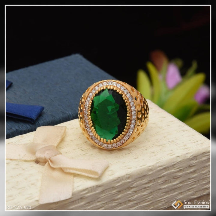 1 Gram Gold Forming Green Stone with Diamond Glamorous Design Ring - Style A970