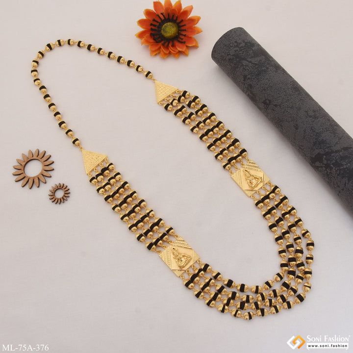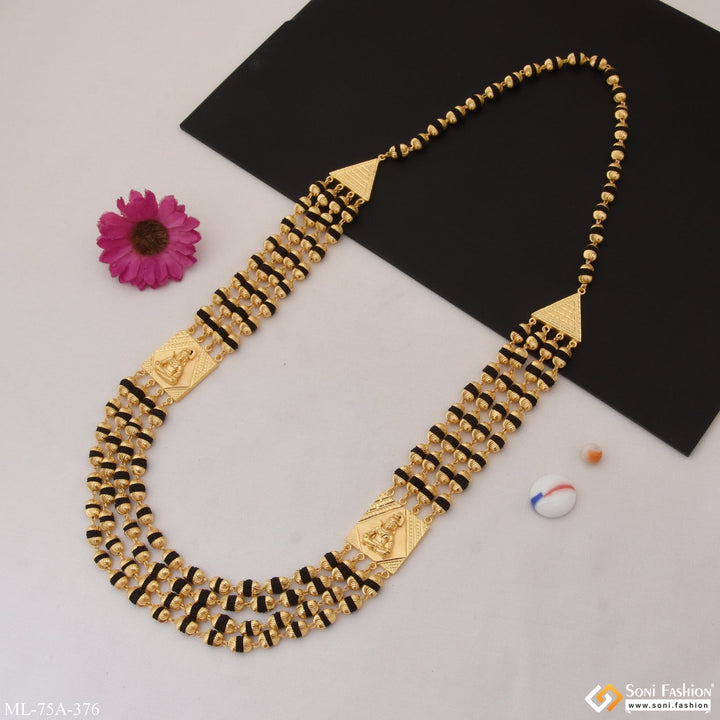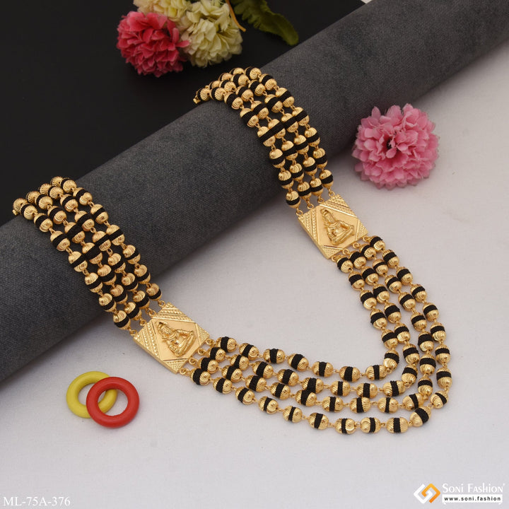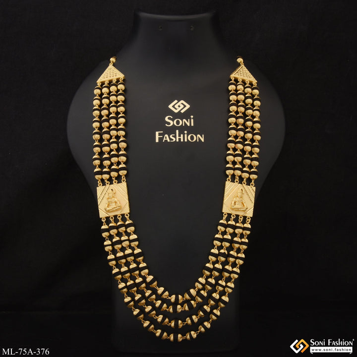 This golden mala features a striking filigree design and is textured for a unique look. Handmade with Rajwadi brass and plated with 1 miligram gold, the Mahadev Rudraksha Mala is a shining symbol of religious devotion. Its black beads add a touch of understated elegance.
