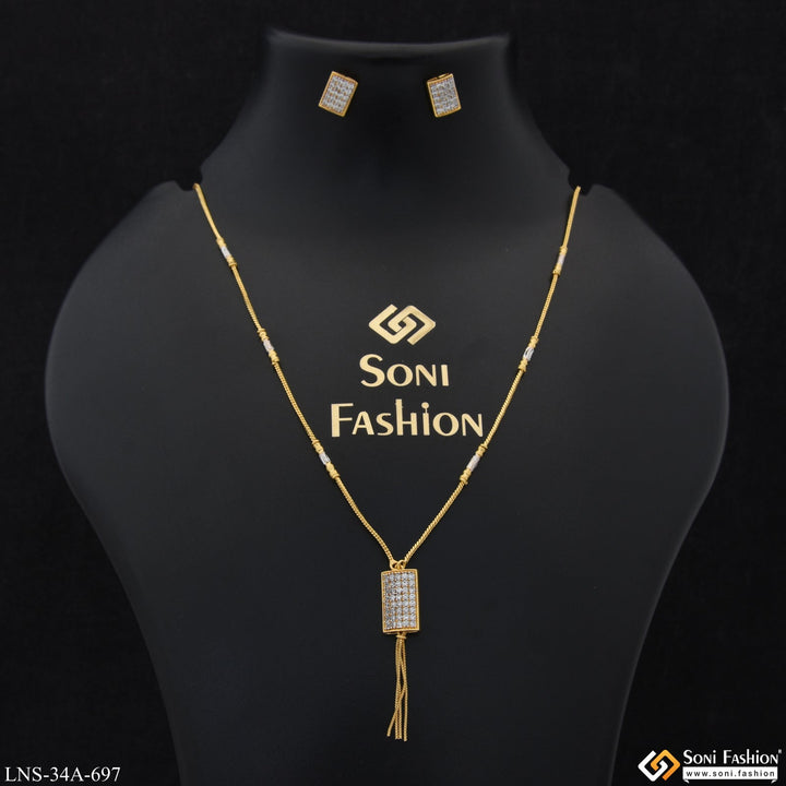1 Gram Gold Plated Rectangle Pendant Necklace Set For Ladies - Style A697