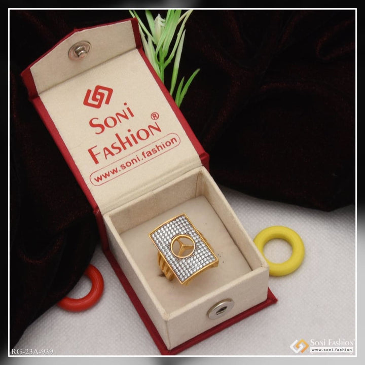 This 1 Gram Gold Plated Triangle With Diamond Glamorous Design Ring is fit for royalty. Made with a combination of rhodium and brass, it showcases a stunning diamond and a miligram of gold for added luxury. Elevate your style with this golden ring that exudes sophistication and elegance.