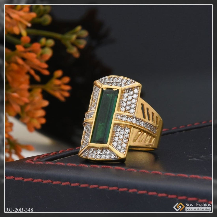 This 1 Gram Gold Plated Green Stone with Diamond Funky Design Ring for Men offers vintage style with textured details. Crafted with a stone, shining and royal rhodium, and miligram...