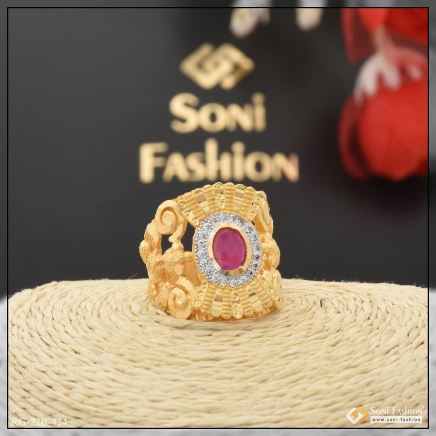 This finely detailed 1 Gram Gold Forming Red Stone with Diamond ring is crafted with textured stone and shining rhodium plated brass. The addition of royal red ring and miligram...