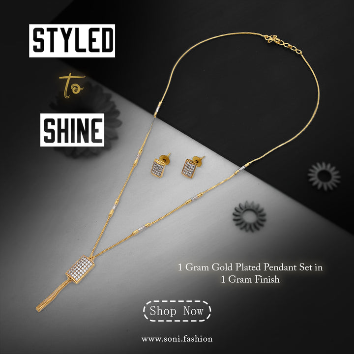 1 Gram Gold Plated Rectangle Pendant Necklace Set For Ladies - Style A697