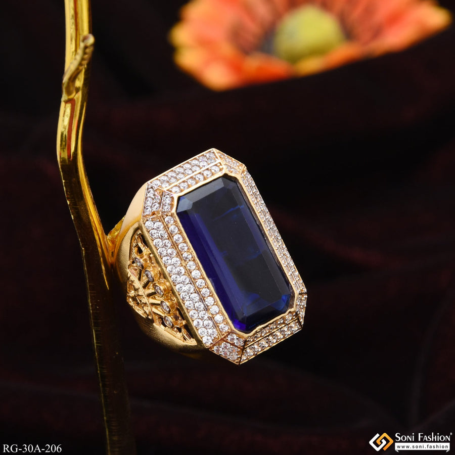 1 Gram Gold Plated Blue Stone With Diamond Gold Plated Ring For Men - Style A206