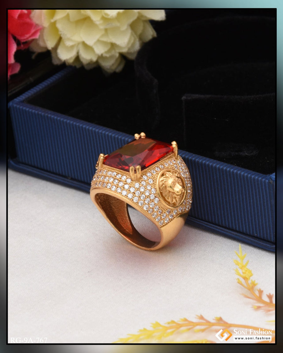 1 Gram Gold Plated Red Stone with Diamond Gorgeous Design Ring for Men - Style B202