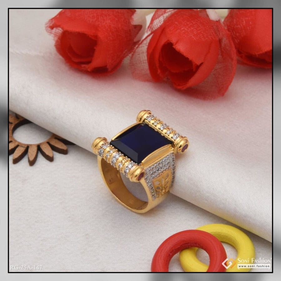 This designer 1 Gram Gold Plated Blue Stone with Diamond Ring is crafted from rhodium plated Brass and features a stunning traditional textured stone in the middle that is sure...