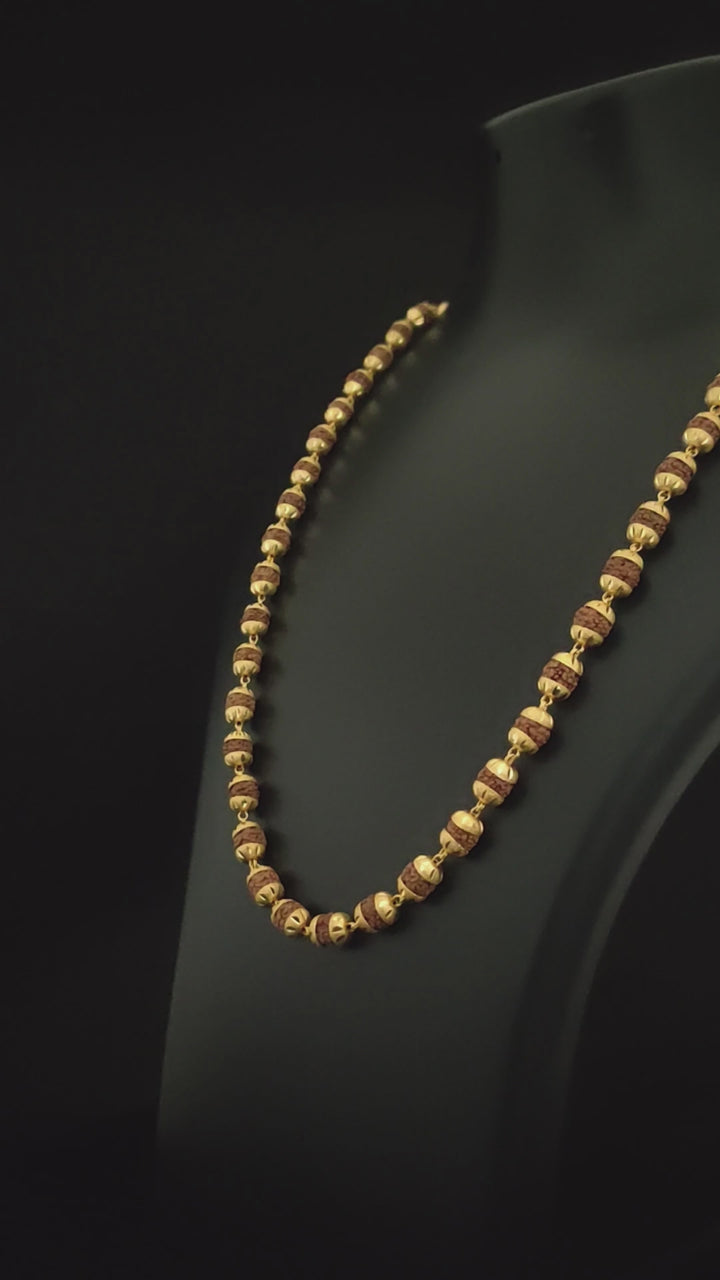 This 1 Gram Gold Rudraksha Mala combines artisanal design with religious significance. Handcrafted with textured brass beads and a miligram gold V-cut finish, this brown mala offers a vintage, elegant look. Perfect for men seeking a meaningful accessory that blends spirituality with style.