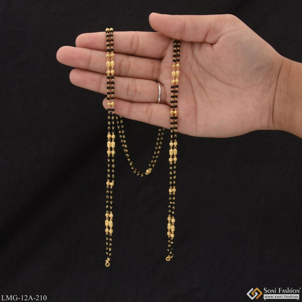 Enhance your beauty with this royal 1 gram gold plated 2 line mangalsutra. Textured and shining, it features a unique casual design and includes brass, black moti, and a black mangalsutra. With a miligram gold finish, add some glamour to your everyday look with this stylish piece.