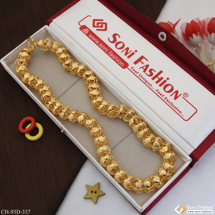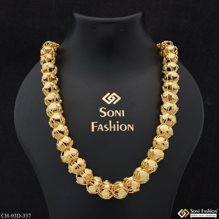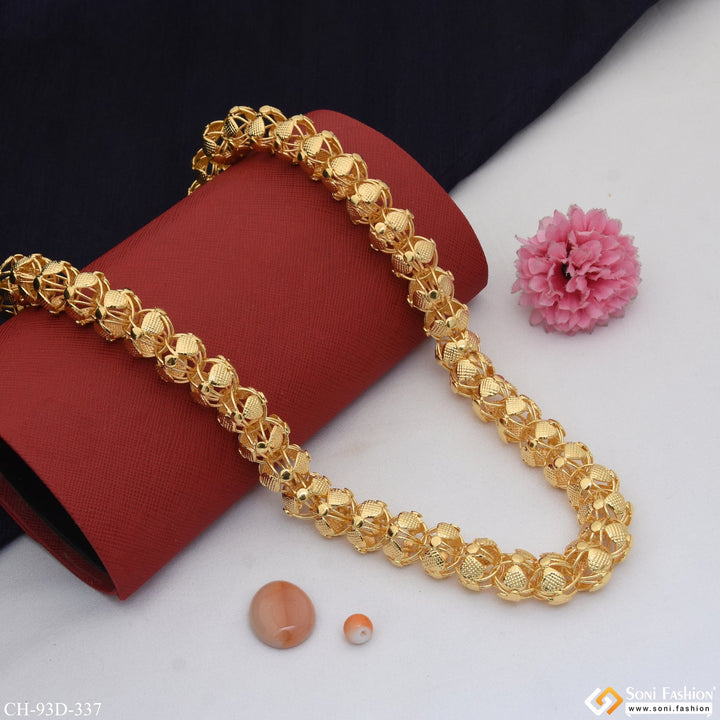 This 1 gram gold plated chain for men features a textured and shining design, inspired by royal Rajwadi styles. Crafted from brass with a miligram gold finish, this 24 inch chain exudes regal charm. Elevate your look with this antique design chain.