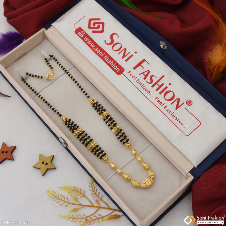 Introducing our latest trend 1 Gram Gold Plated Dazzling Design Mangalsutra for Women. This golden mangalsutra is shining and bridal, perfect for any special occasion. Made of brass with black moti, it's both stylish and elegant for the modern woman. Elevate your look with this classic piece.