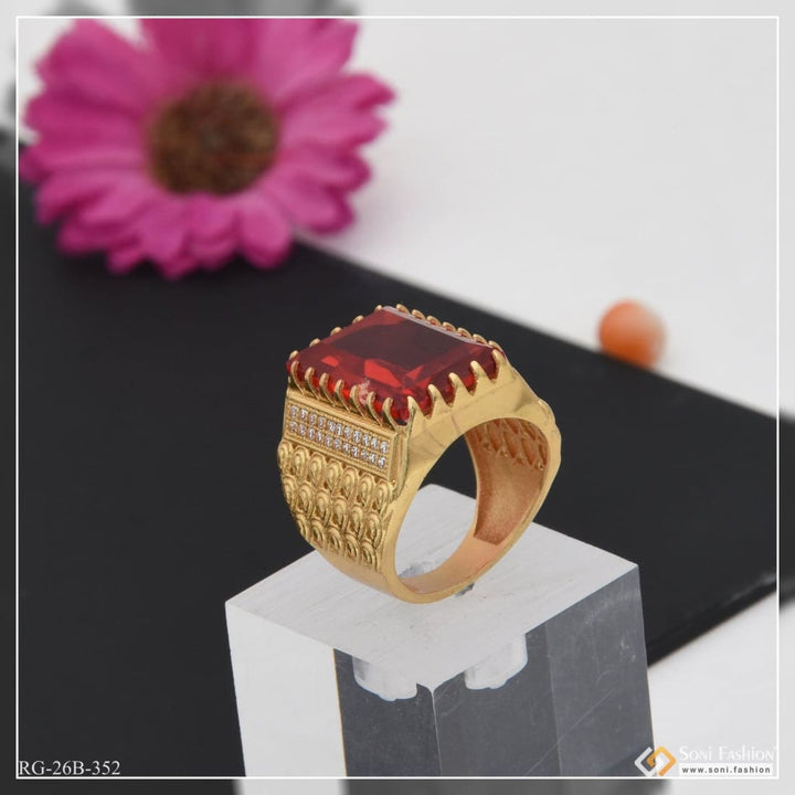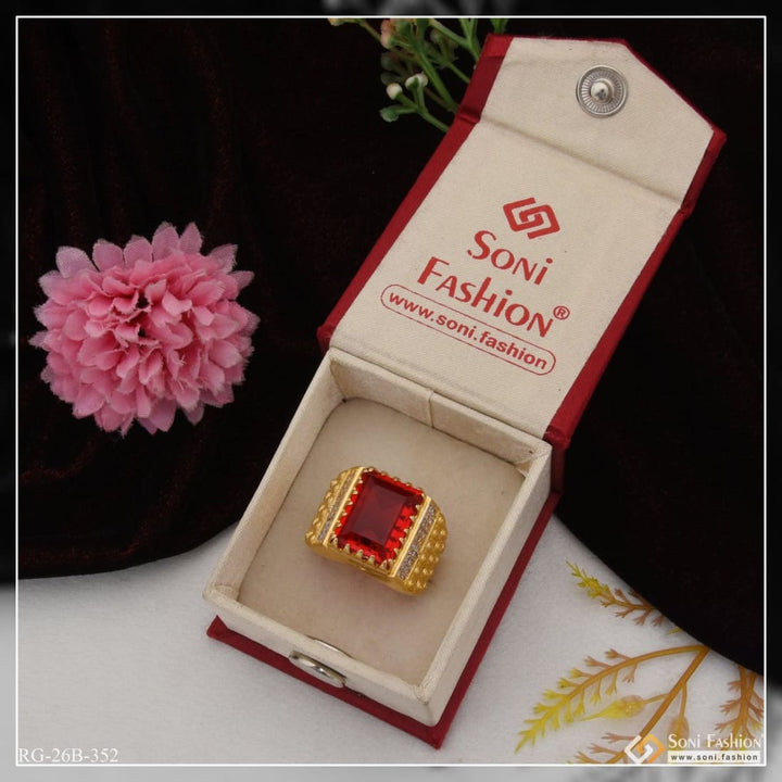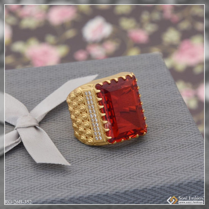 1 Gram Gold Plated Red Stone With Diamond Antique Design Ring For Men - Style B352