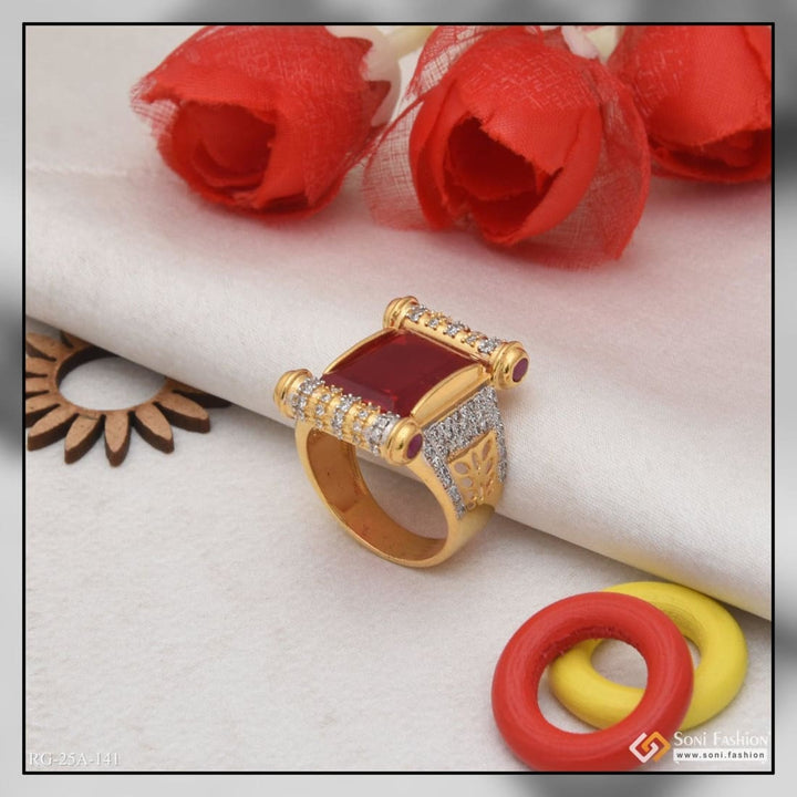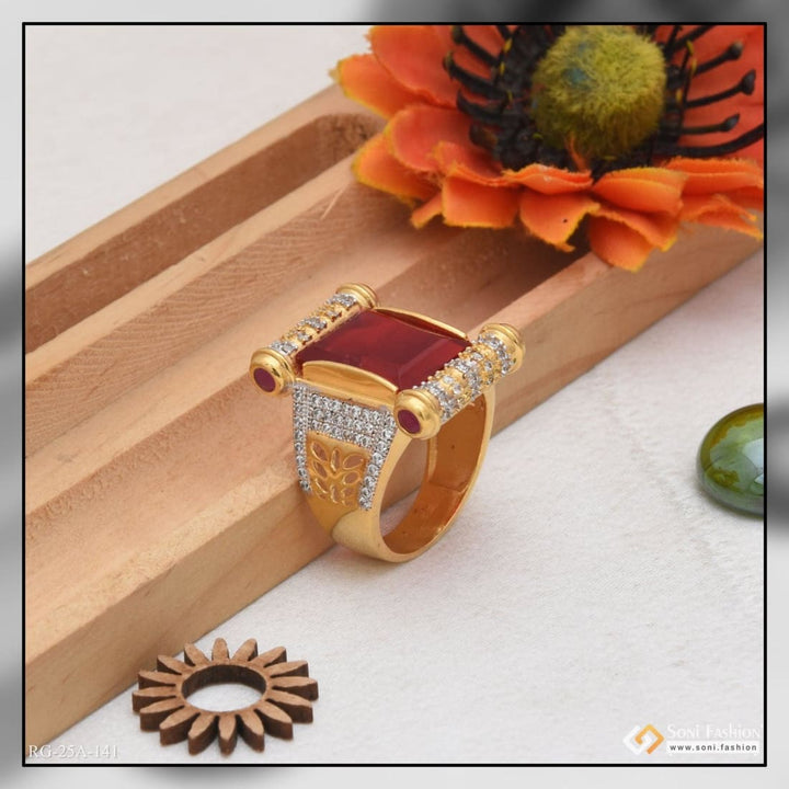 1 Gram Gold Plated Red Stone With Diamond Gold Plated Ring For Men - Style A141
