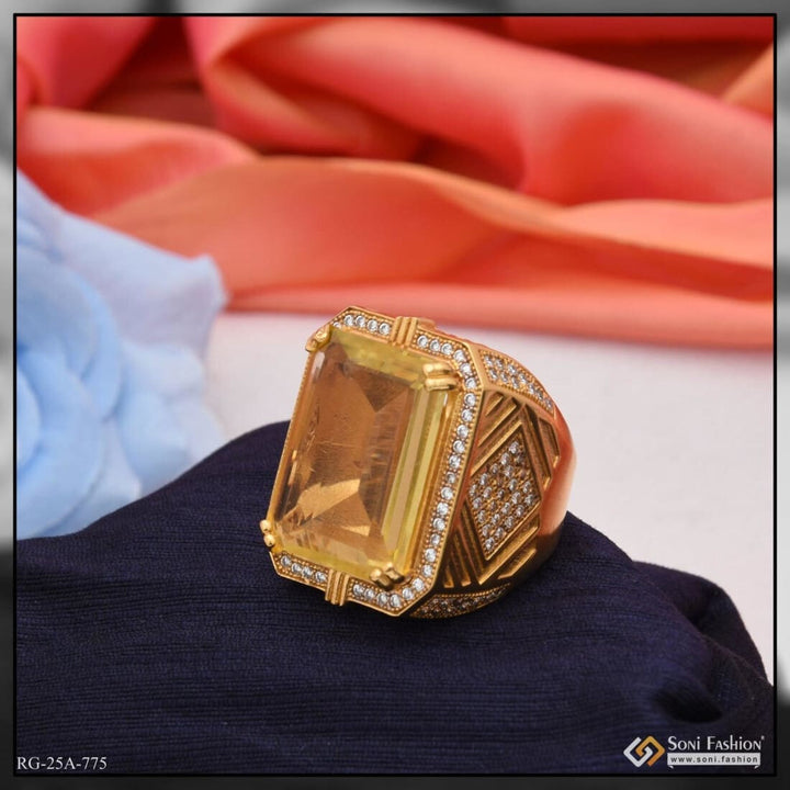 1 Gram Gold Forming Yellow Stone With Diamond Gorgeous Design Ring For Men - Style A775