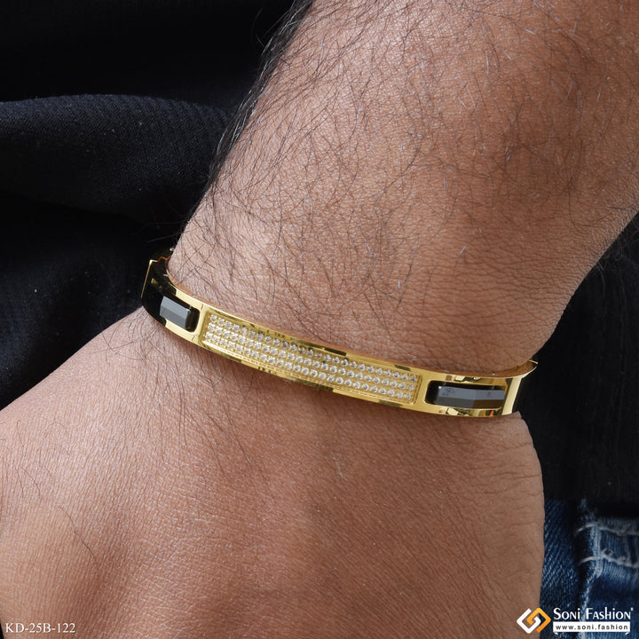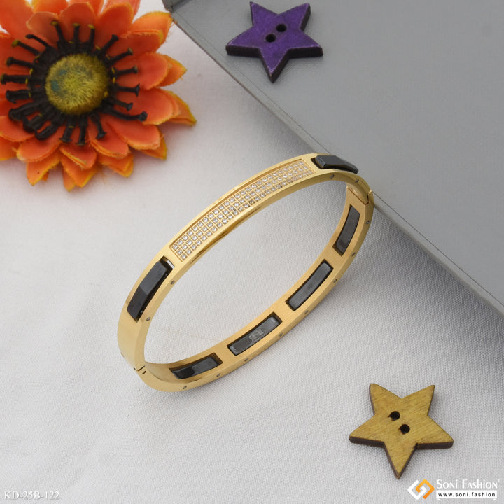 Introducing our Amazing Design Black & Golden Color Ceramic & Steel Kada for Men. This kada features a shining, plain, oval design made with stainless steel and ceramic materials. With hip hop style and a hidden reg plating, it also showcases a stunning golden diamond. A perfect combination of style and durability.