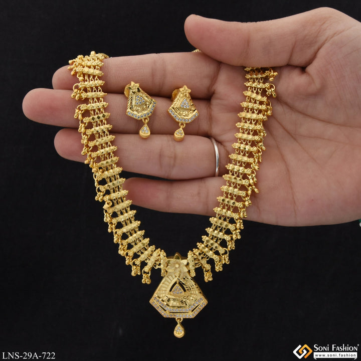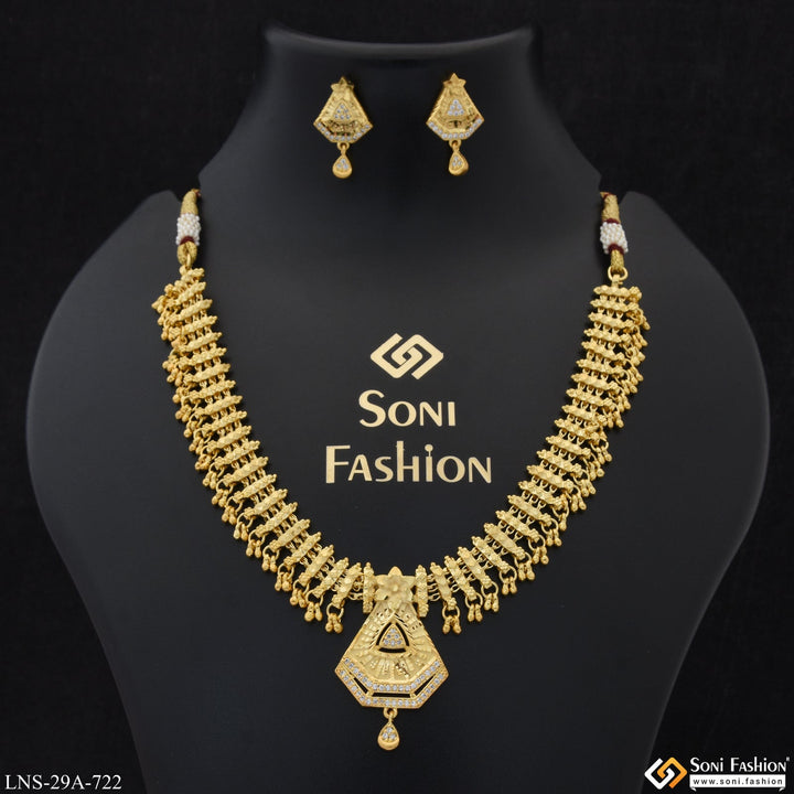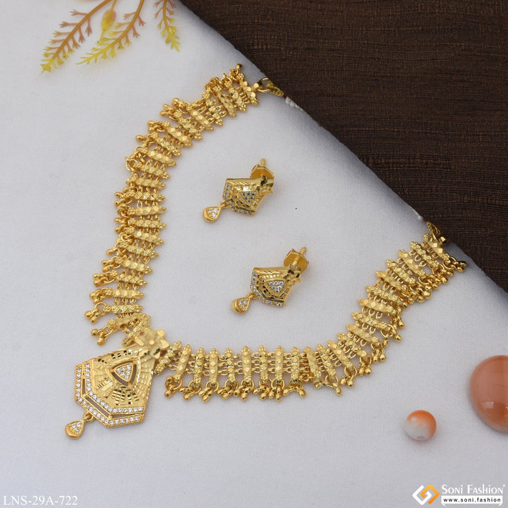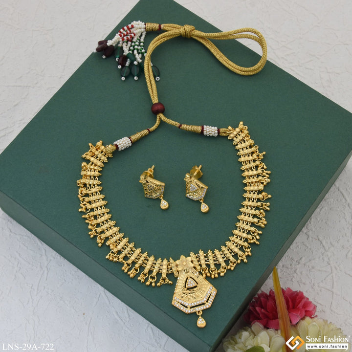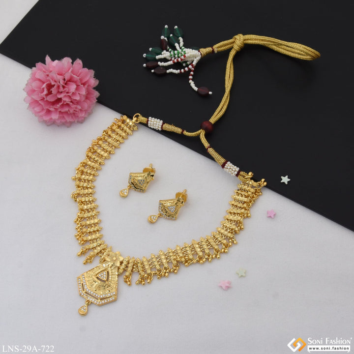 This Decorative Design Fashionable Gold Plated Necklace Set for Women is a stunning statement piece. Its thread, textured, and shining features add a touch of elegance and sophistication. The royal design...