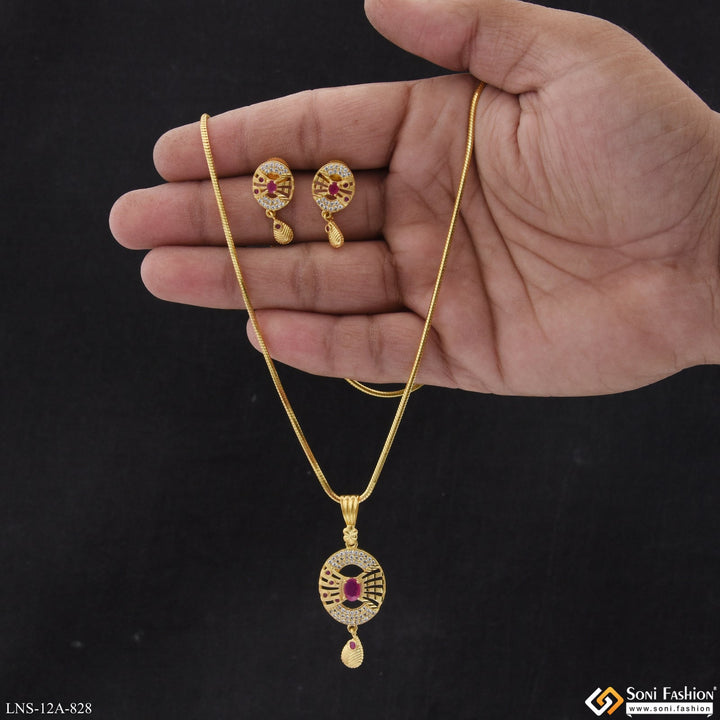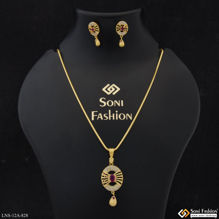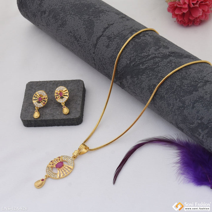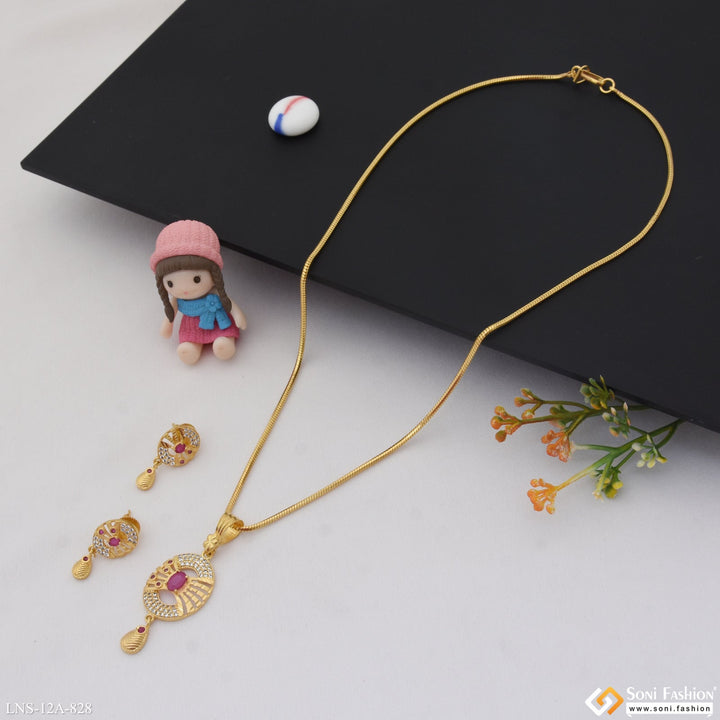 Discover elegance and sophistication with our Decorative Design Gold Plated Necklace Set for Ladies. The shining pink necklace set is the latest trend in jewelry, featuring hid_reg_plating for a lasting golden finish. Its diamond accent brings sparkle and glamour, all crafted with durable brass. Elevate your style with this stunning set.