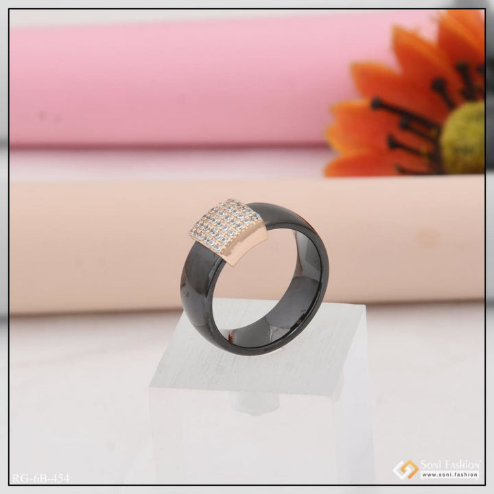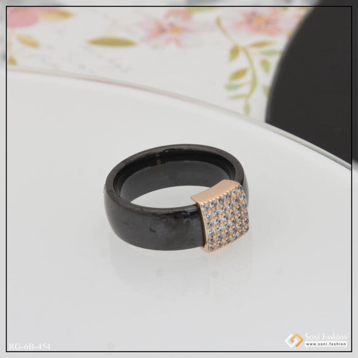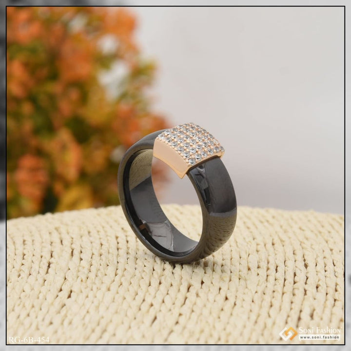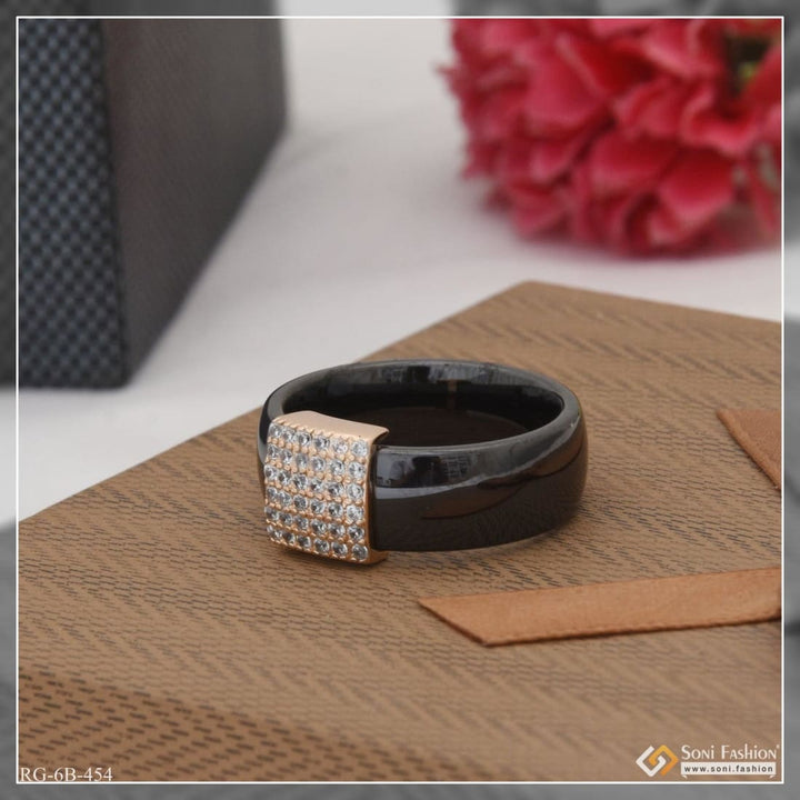 This black ring is designed for men with exceptional style, featuring diamond accents and a trendy textured finish. Crafted from stainless steel with stunning rose gold plating and a personalized etched finish, this ring shines with hip-hop glamour. Complete with ceramic detailing, it's perfect for any modern look.
