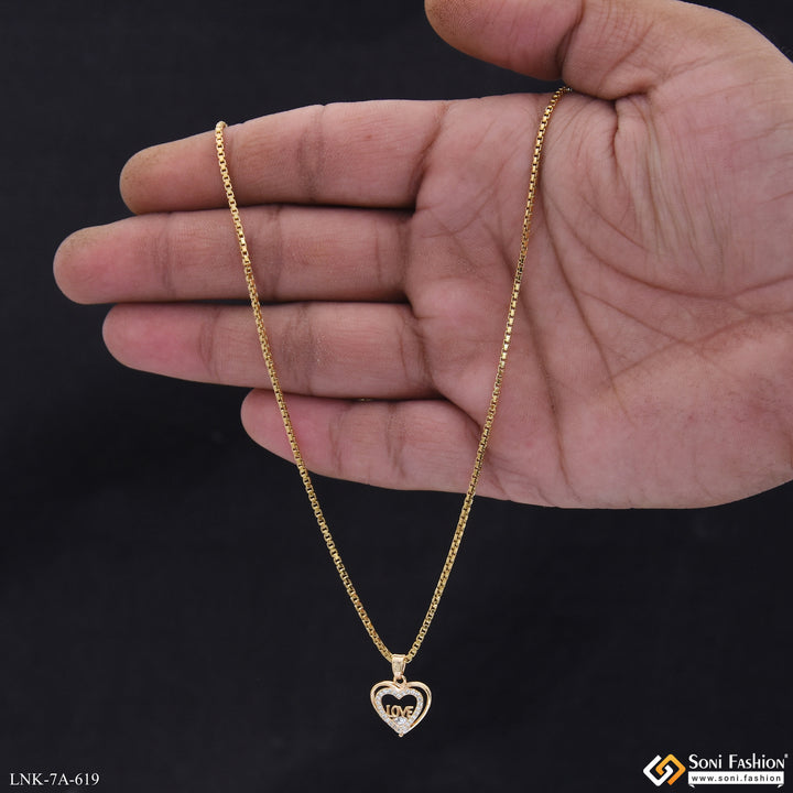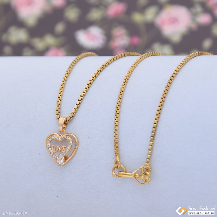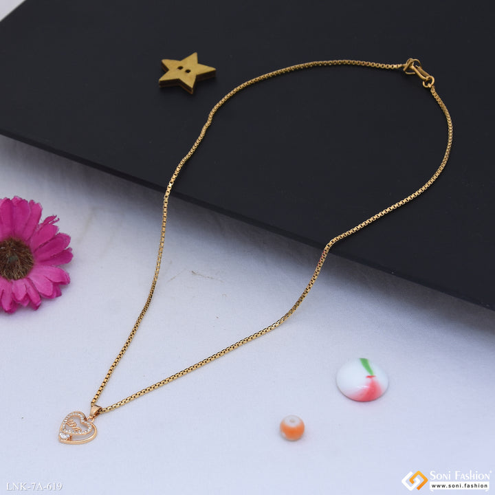 As an industry expert, introduce the Funky Design Gold Plated Chain Pendant for Ladies. Featuring a shining heart pendant with a trendy design, this necklace is plated with Hid_Reg_Plating for a golden finish. Made of brass, it also includes a sparkling diamond for added luxury.