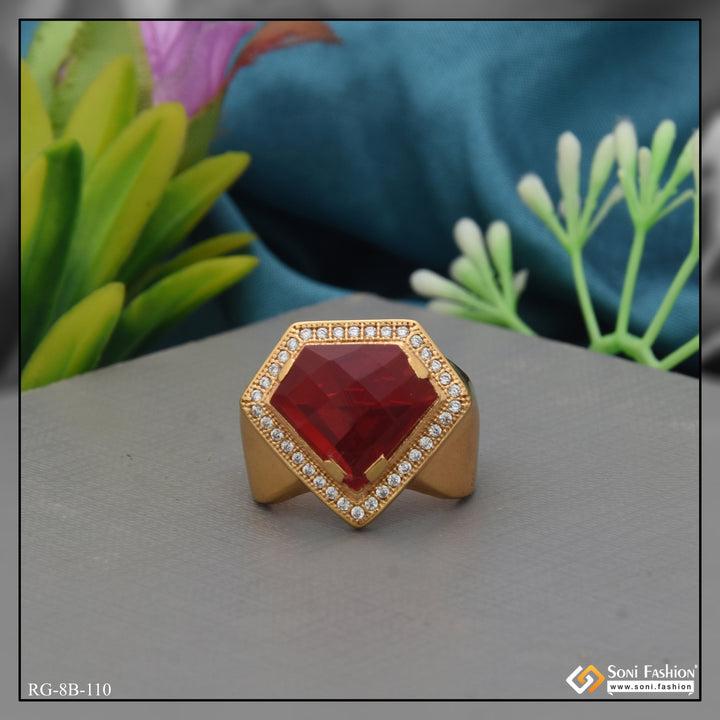 This stylish Heart Shape Red Stone Gold Plated Ring features a dazzling diamond and brass construction, making it a fashionable choice for any occasion, especially Valentine's Day. Its hip hop-inspired design and hidden regular plating add a touch of uniqueness to this romantic piece.