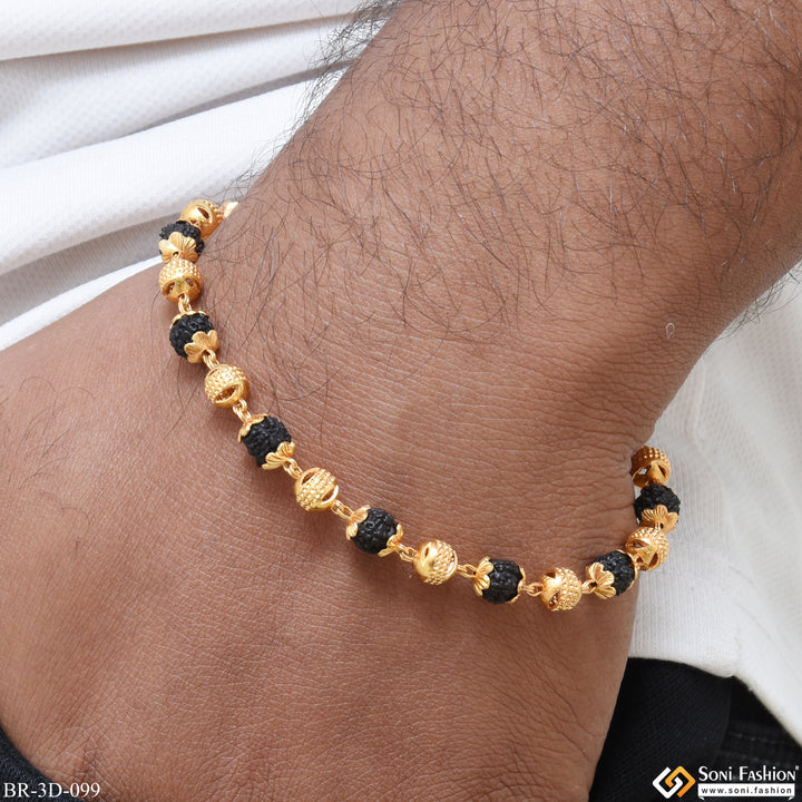 Embody grace and style with our Latest Design Gold Plated Rudraksha Bracelet for Men. Each textured, shining Rudraksha bead holds religious significance while the brass and hid_reg_plating ensure lasting quality. Handmade with precision, this royal black and gold bracelet is a must-have for the modern man.