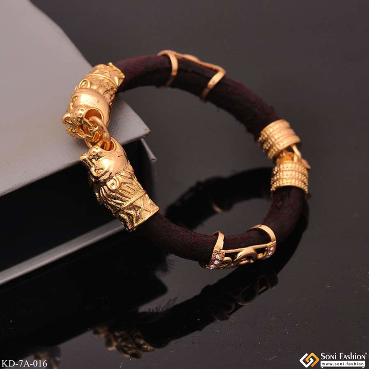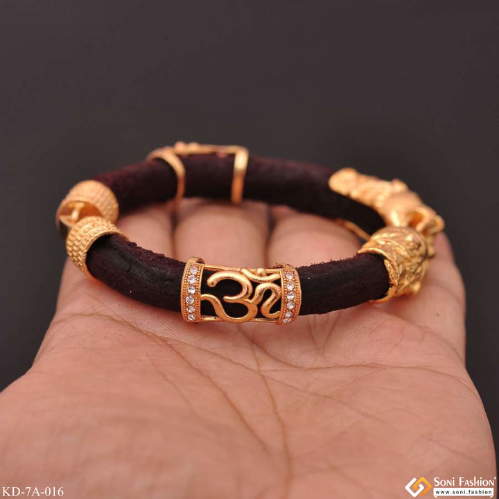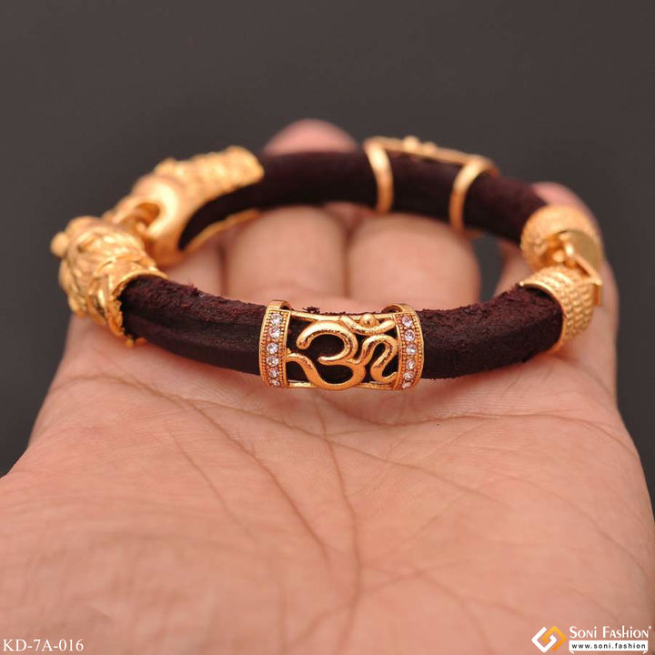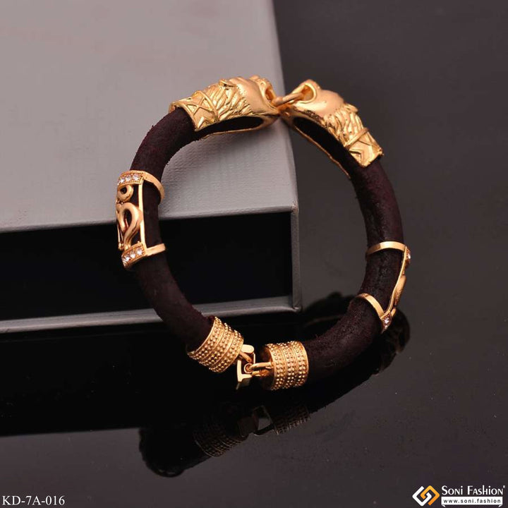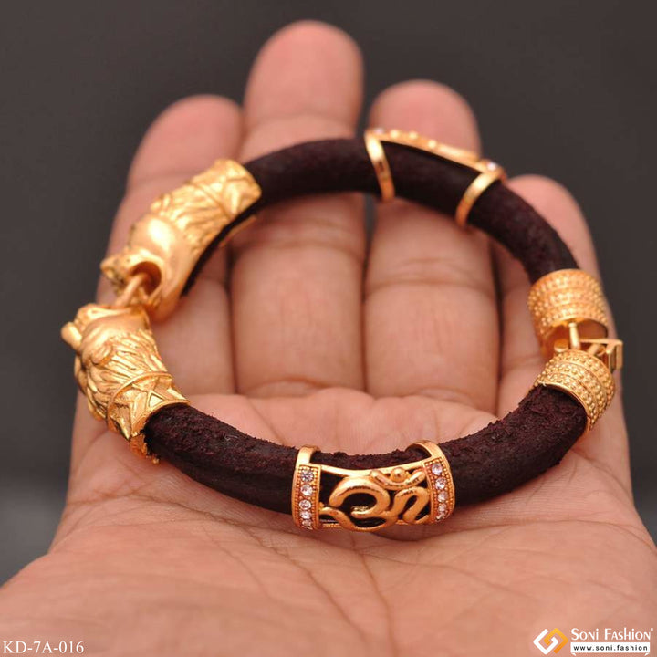 Two-Lion Face & Om Genda Kada Classic Design Leather Gold Plated for Men - Style A016