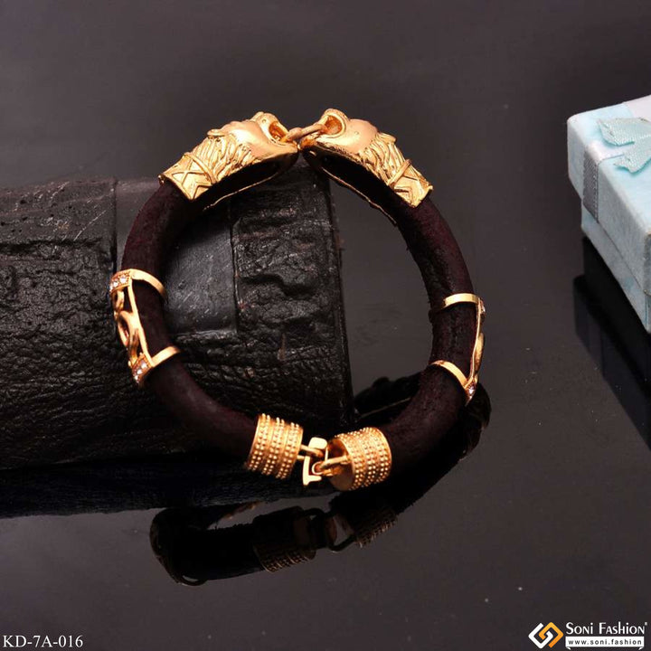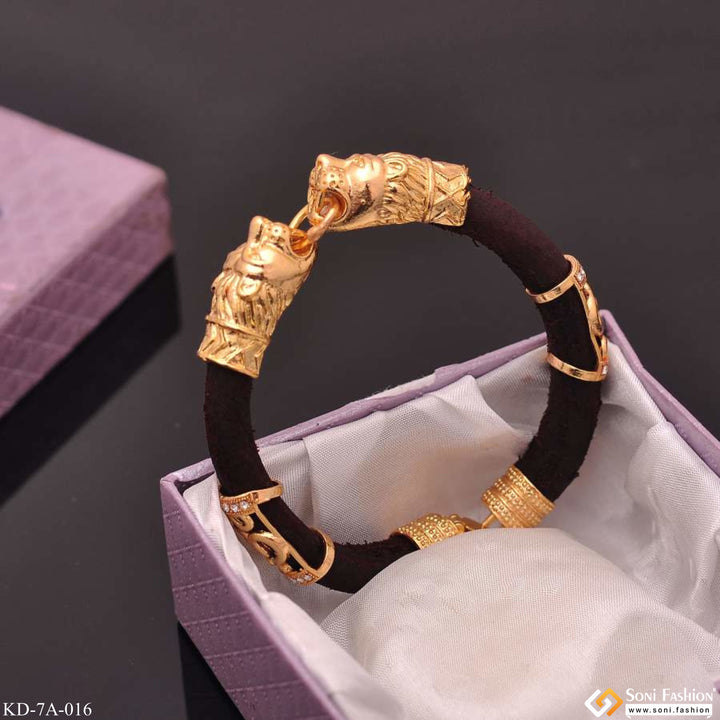 The Two-Lion Face & Om Genda Kada Classic Design Leather Gold Plated for Men is a luxurious and classic piece of jewelry. Its leather construction is complemented by a royal, textured exterior and a gold plating with Om, Lion Face, and diamond designs. Its Round Kada, Rajwadi, and Black Kada designs make it the perfect accessory for a sophisticated look.