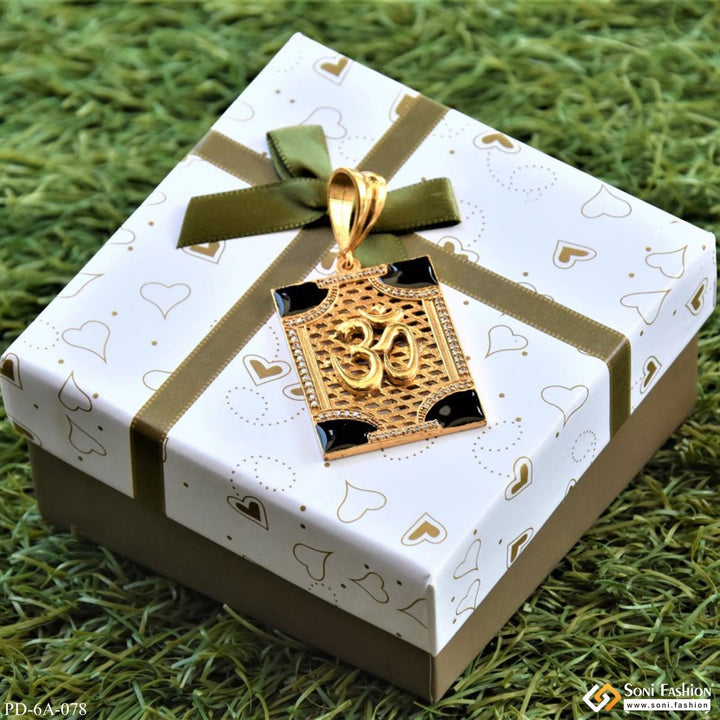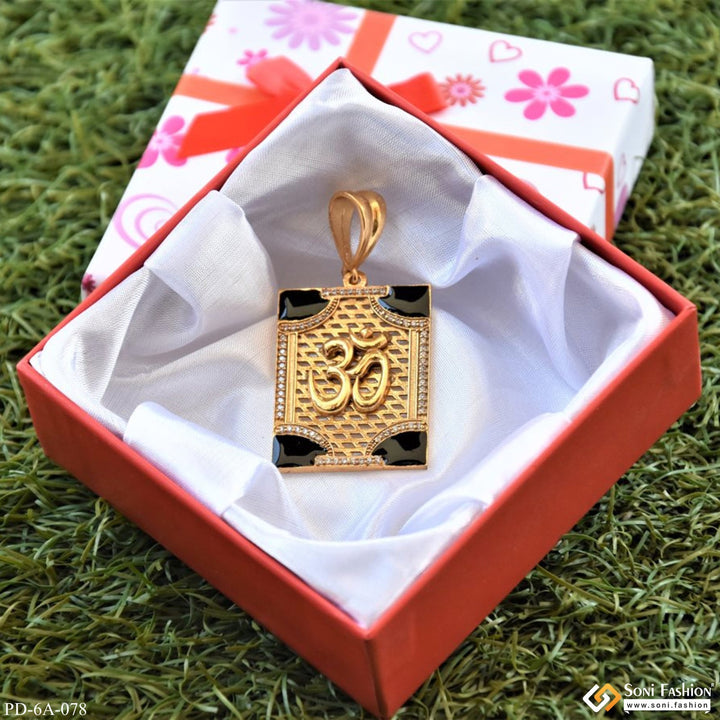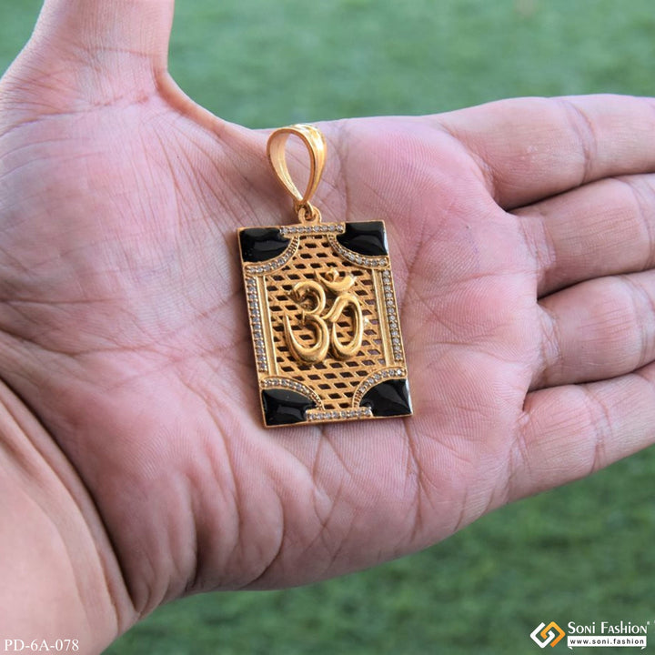 This OM Rectangle Pendant with Black Corner Design And Diamonds is crafted with exquisite brass and is textured with a shining, royal, religious Om design. It features a square pendant and a black pendant for an elegant, antique look. To finish it off, this pendant is adorned with diamonds for an extra special finish.