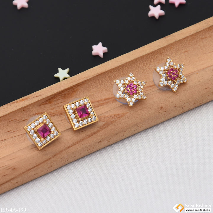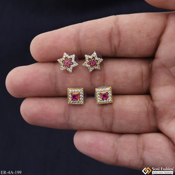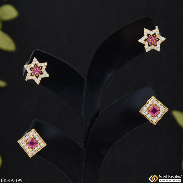 Pink Diamonds Gold Plated Two Stud Earrings Set for Ladies - Style A199