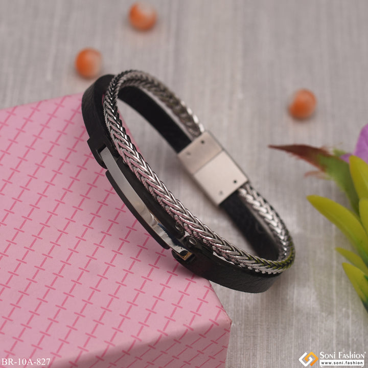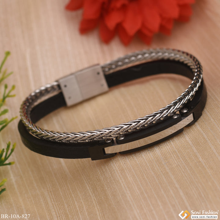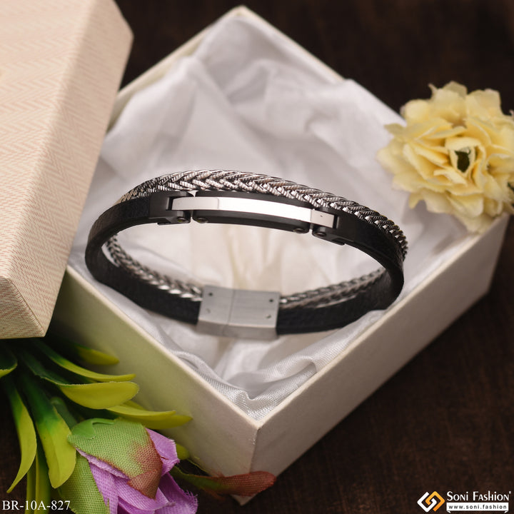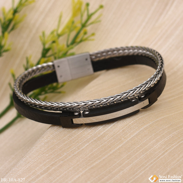 Silver and Black Net Attaractive Design Black Leather Braided Bracelet - Style A827