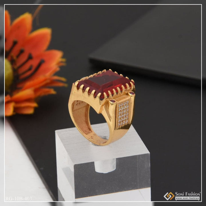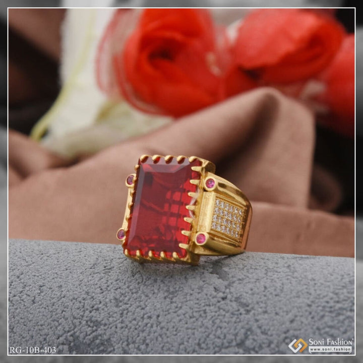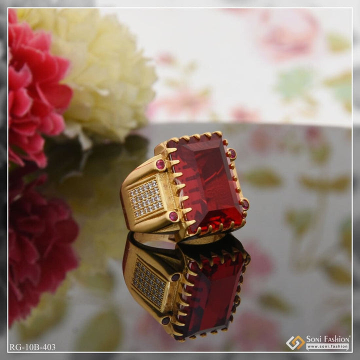 Red Stone With Diamond Sophisticated Design Gold Plated Ring For Men - Style B403
