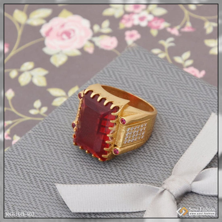 This Red Stone with Diamond Sophisticated Design Gold Plated Ring for Men is made of textured brass and features a rectangle Rajwadi ring with a red stone set in a diamond, lending a shining, hip-hop look. The gold plating provides an added layer of sophistication.