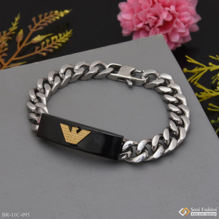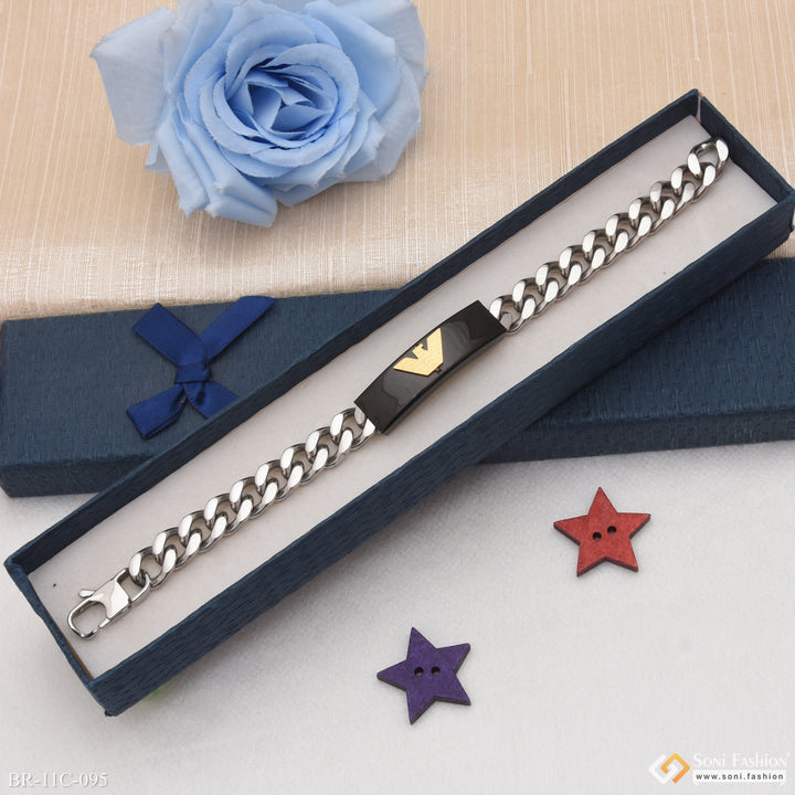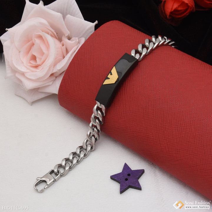 This W Shape Artisanal Design bracelet exudes a royal and hip hop vibe, perfect for men with a unique sense of style. It features a stunning combination of black and golden color, made with durable stainless steel and plated with Hid_Reg_Plating. Elevate your look with this eye-catching and stylish bracelet.