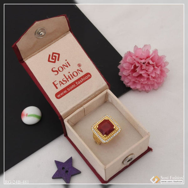 1 Gram Gold Plated Red Stone with Diamond Amazing Design Ring for Men - Style B481