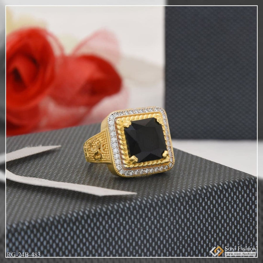 1 Gram Gold Plated Black Stone with Diamond Latest Design Ring for Men - Style B483