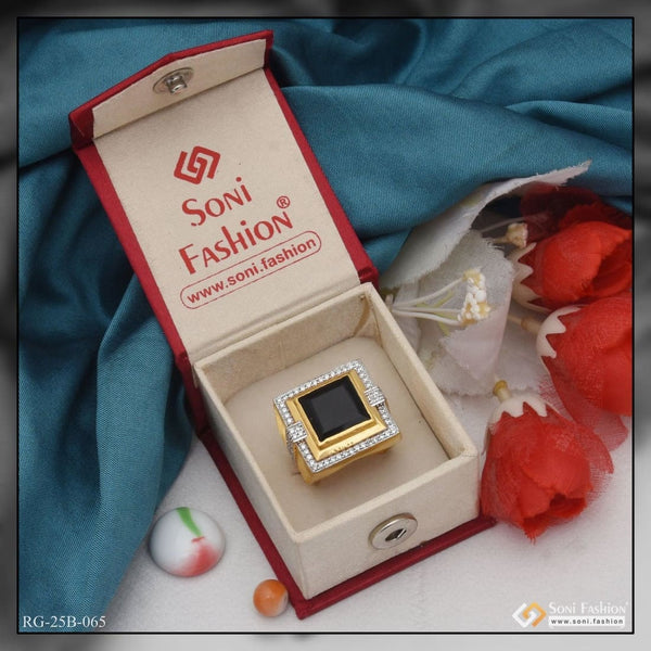 1 Gram Gold Plated Black Stone With Diamond Hand-crafted Ring For Men - Style B371