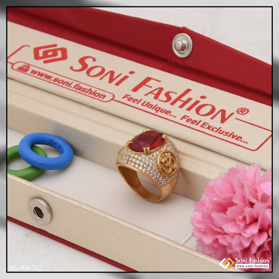 1 Gram Gold Plated Red Stone with Diamond Gorgeous Design Ring for Men - Style B202