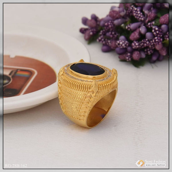 1 Gram Gold Plated Blue Stone With Diamond Hand-crafted Ring For Men - Style B386